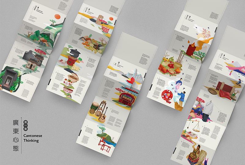 Through the lens of visual communication design, you embark on a personal journey to discover what is the Cantonese culture like in Singapore. Utilising the design research method of Intangible Cultural Heritage Valorisation, the intangibility of Cantonese culture has thus been analysed, illustrated, documented and presented in three aspects (Thinking, Feeling and Experience).